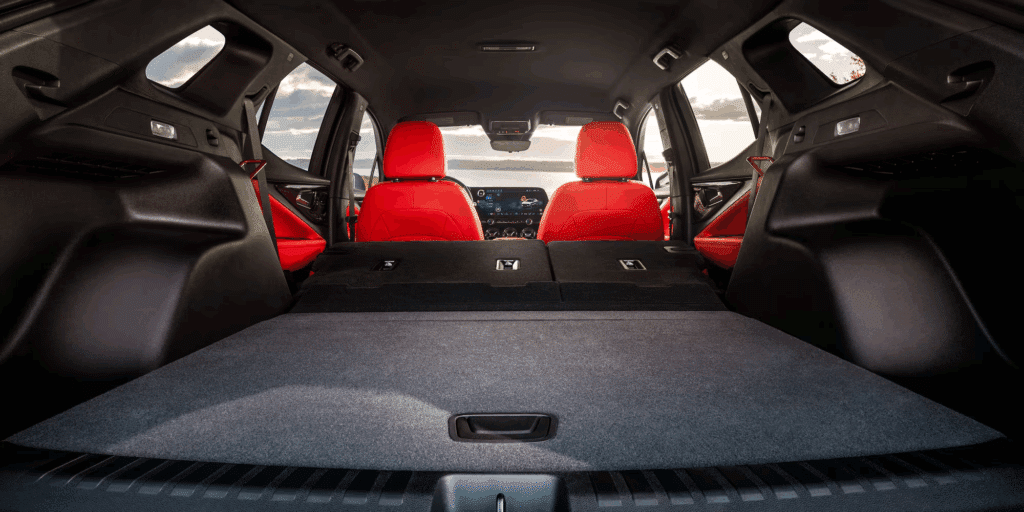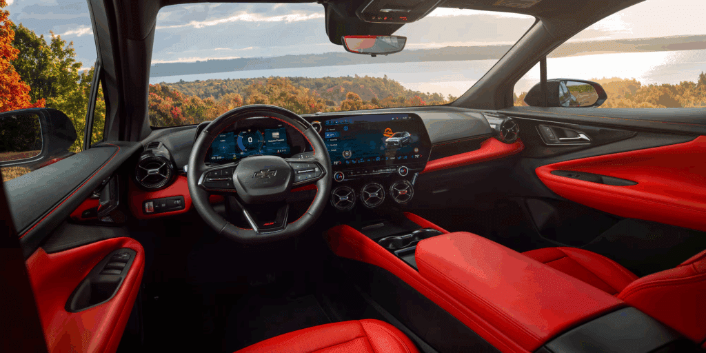 The spacious interior of Blazer EV offers performance seating, an available race car-inspired flat-bottom steering wheel and ambient lighting to match your vibe.